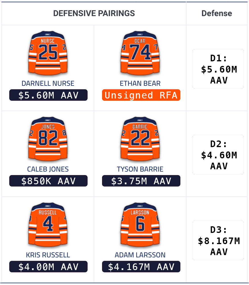 With Klefbom out, their top-pair figures to be @Darnell Nurse and @Ethan Bear. Nurse and Bear played together more than any pairing in the NHL last season, logging 1157.5 5v5 minutes together. Of the 40 D-pairs that played at least 500 minutes together, Nurse and Bear ranked ninth in GoalsFor/60 (2.85) but struggled defensively, giving up the third-most GoalsAgainst/60 (3.16).