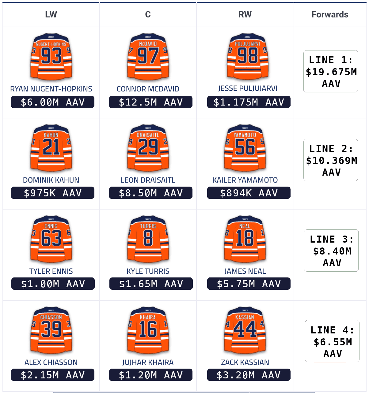 That leaves Chiasson and Kassian to play with @Jujhar Khaira/@Gaetan Haas and @Josh Archibald on the outside looking in. This lineup is capable of getting offence from their top-9 with a heavy fourth-line, a recipe that worked well for the @Tampa Bay Lightning last year. It’s their most balanced look on paper, but Tippett will have a lot of options. Something that couldn’t be said about the Oilers in years previous.
