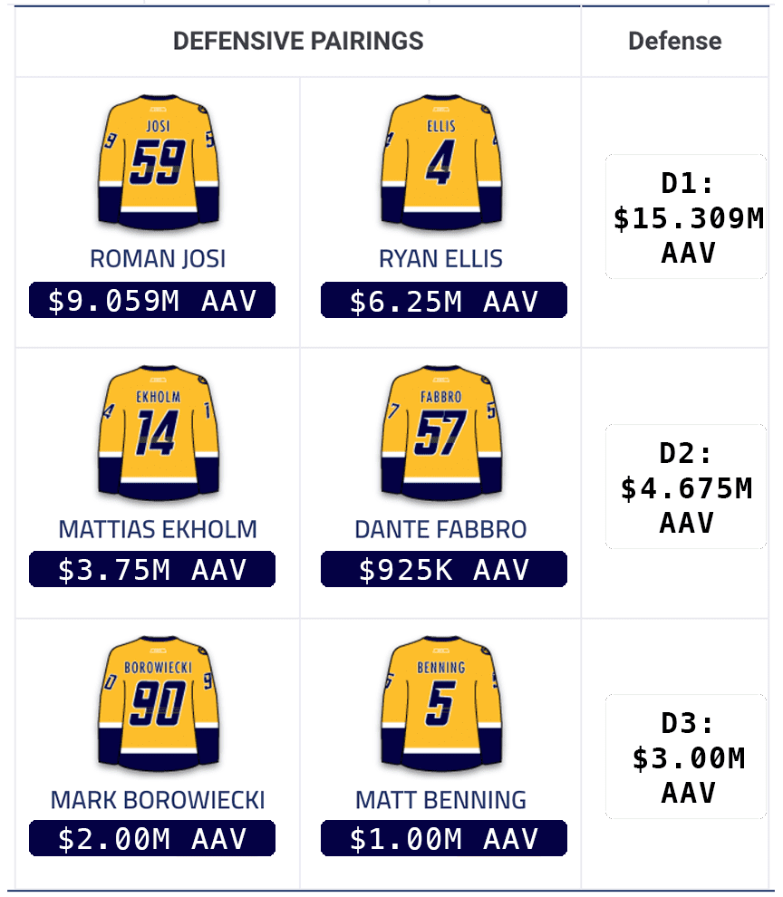 A completely new third-pair of @Mark Borowiecki and @Matt Benning was brought on in free agency to replace a rotation of @Dan Hamhuis, @Yannick Weber, @Jarred Tinordi and @Matt Irwin. Hynes will be picky with his matchups with this pairing but they should be a nice blend of styles. Borowiecki is a big, rugged defenseman while Benning is more of a puck-moving, offensive-defenseman. Both are best suited for limited minutes, so this sheltered role should serve both of them well.