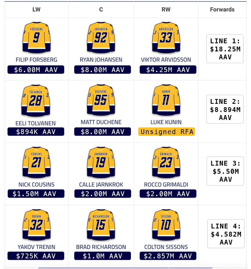 Adding a player with the offensive upside of Kunin was needed but losing Bonino and @Craig Smith is going to hurt more than many realize. Along with @Rocco Grimaldi, that trio made up one of the best third lines (if not the best) in the NHL a season ago, leading the entire NHL in GF% (72.5). They were ridiculously effective in limited minutes, leading the league in GF/60 (4.34) but also lock-down defensively, giving up the fifth least GA/60 (1.64) among lines who played at least 400 5v5 TOI together. All three of those numbers are better than what @Brad Marchand, @Patrice Bergeron and @David Pastrnak put up and they’re known as “The Perfection Line.” Unlike the top-6 It’s hard to pinpoint exactly how this bottom-6 will shake out but it figures to include Grimaldi, @Calle Jarnkrok, @Colton Sissons and @Yakov Trenin, who were with the Predators last season and newcomers @Nick Cousins and @Brad Richardson. Cousins was an effective bottom-6 player for both Montreal and Vegas last year, so he should be a reasonable replacement for Smith, albeit with far less goal-scoring upside. Jarnkrok is most closely comparable to Bonino but Richardson is by far the better shutdown centre. So how they are put together really depends on what Hynes wants out of his third and fourth line. He can try and create a decent scoring third line with Trenin-Jarnrkok-Grimaldi as his third line or try and create two “shutdown lines” and balance out what offence is available to him. I’m leaning towards the latter being the most likely scenario.