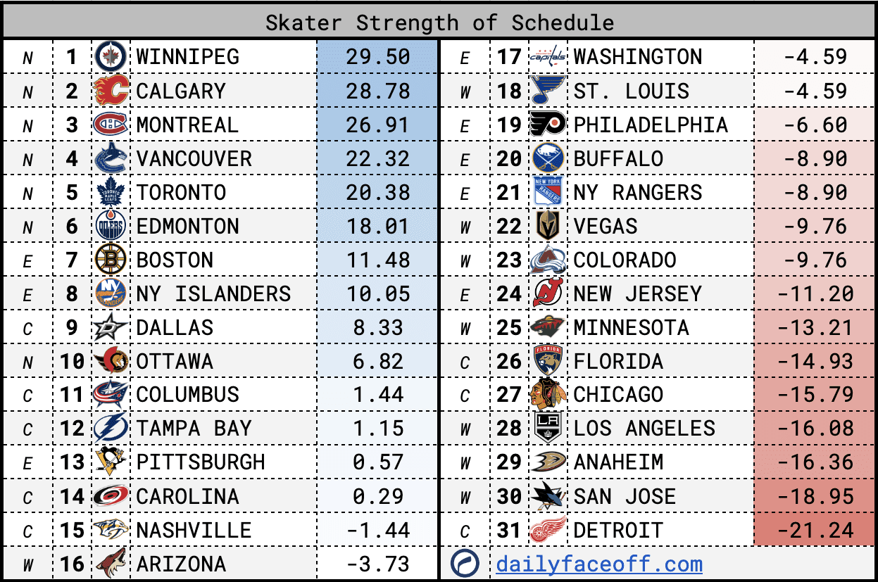 Think of this as a “strength of schedule” for skaters. When you’re between two players on draft day, this should be a useful tool to help you make those tough decisions.
