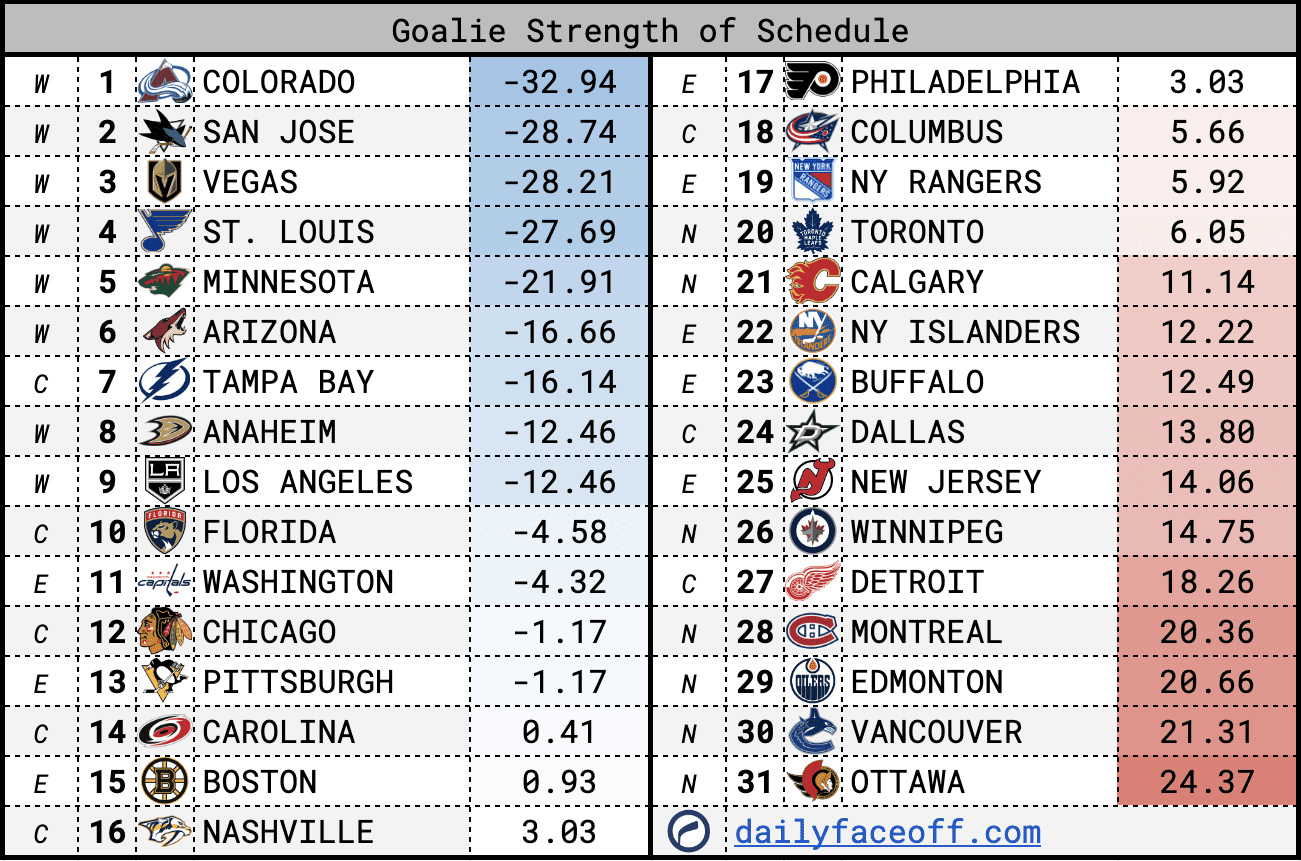 As high-scoring as the North looks like it’s going to be, the opposite looks true for the West. That shouldn’t come as too much of a surprise however, Arizona, St. Louis and Colorado were all in the top-6 in GA/gm. This shouldn’t hinder your outlook on players like @Nathan MacKinnon or @Mikko Rantanen but it should be a determining factor when considering some of the periphery options on those teams.