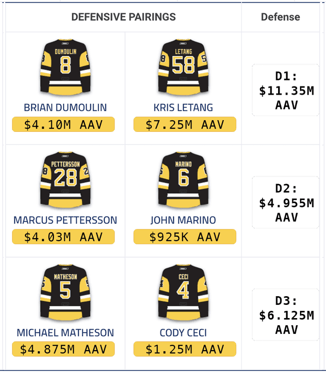 The second pair of @Marcus Pettersson and @John Marino is back after a surprising breakout season in 2020. Marino just recently signed a six-year contract extension and the Penguins desperately need this young pairing to be great again this season. This pairing is the polar opposite of what Letang was last season, ranking 79th/100 in GF/60 (2.07) but 16th in GA/60 (1.78). These two play the toughest minutes on the team and still graded out as one of the better defensive pairings in the league. As a result, both have limited fantasy upside but they should see some power-play time which could make them DFS punts on most nights.