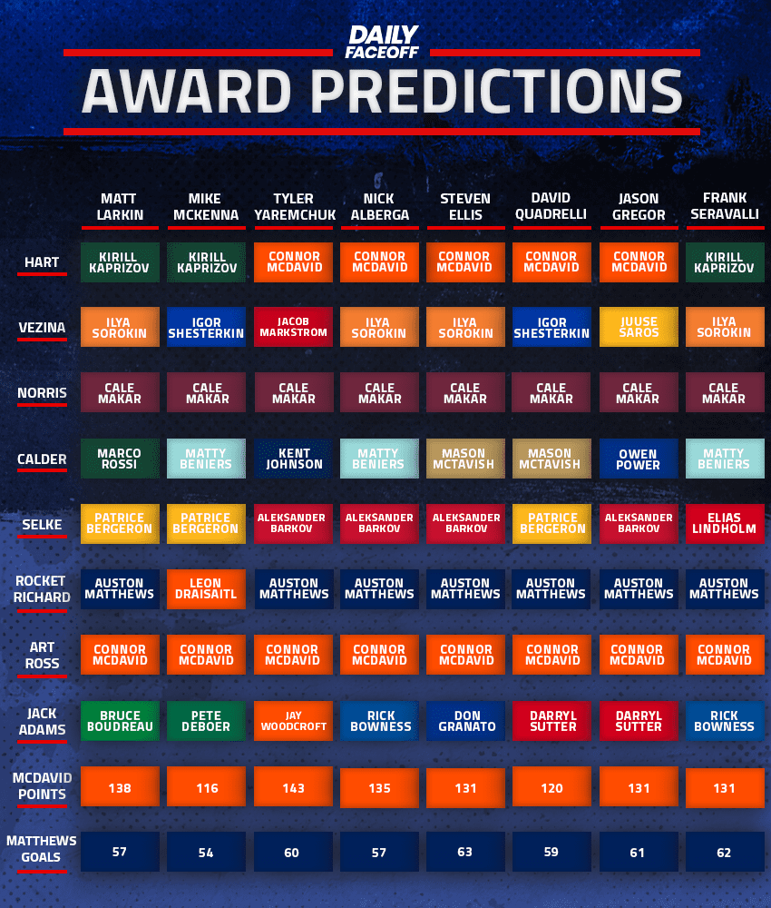 Eight members of the senior Daily Faceoff staff have cooked up their best guesses at who takes home the following NHL hardware this season:
