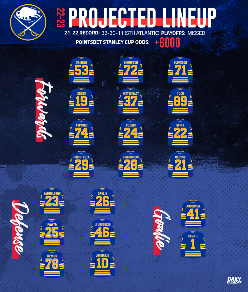 Tage Thompson popped off with 38 goals and 68 points, a shocking performance given he had scored 35 points in 145 career NHL games coming into last season. Dylan Cozens scored 13 goals and 28 points in his second full season in the league and a healthy Rasmus Dahlin notched a career-high 53 points.