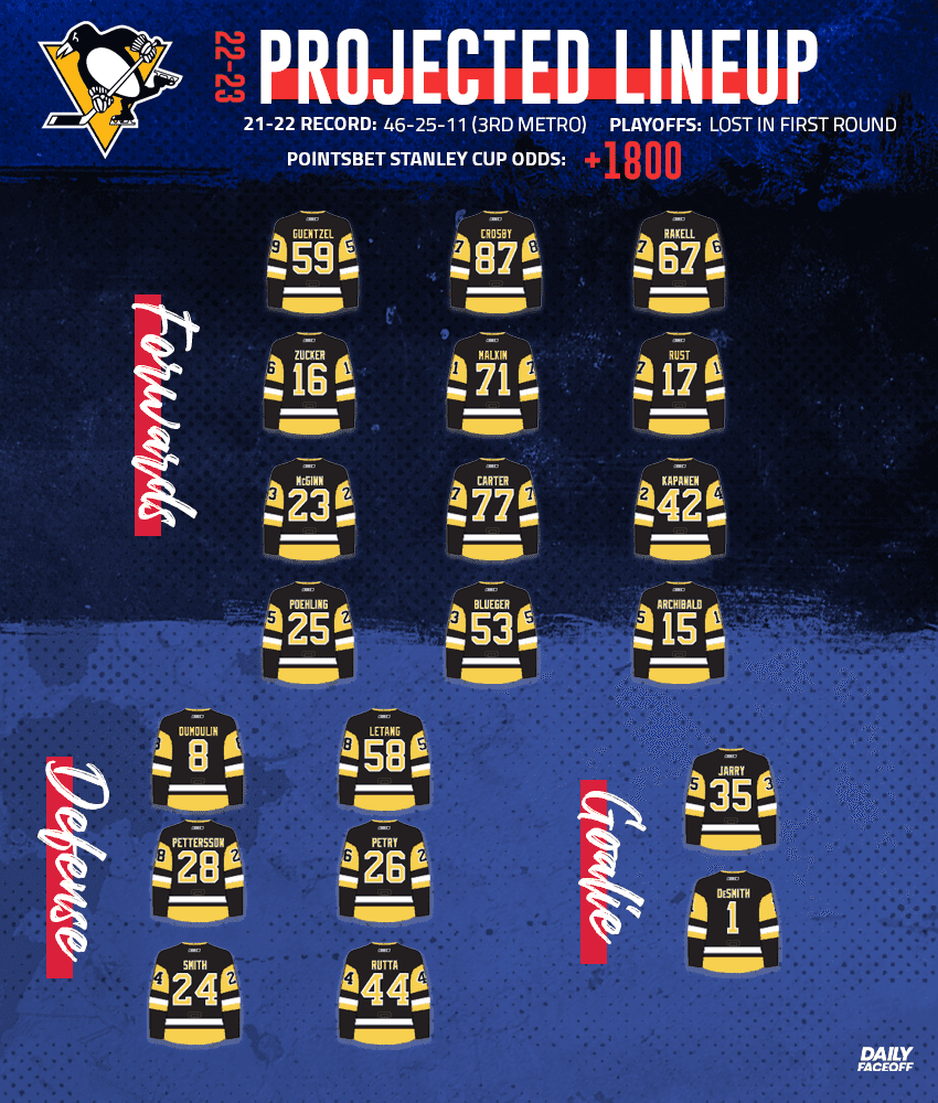 The Pens will once again look to Tristan Jarry and Casey DeSmith in net, a duo that has proven to be reliable for them when healthy. Jarry rebounded from a rough season in 2020-21 with a .919 save percentage in 56 games, although injuries sidelined his postseason appearance until Game 7, where he was thrown to the wolves against Igor Shesterkin of all goalies.