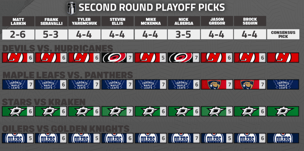 Interestingly, while three of five series were split down the middle for Round 1, we have a strong group consensus for each series in Round 2. The Kraken are a great story, but they beat a badly depleted version of the Avs, so we all expect the fun to end against the Stars. Every one of us likes the Edmonton Oilers to take out the Golden Knights, and some of us even expect a short series. Not everyone agrees on the winner for the Leafs vs. Panthers, but most of us lean Toronto’s way, and we all predict a long series. Meanwhile, there’s little confidence that the Canes, without two of their top forwards, can keep up with the New Jersey Devils, who made an impressive comeback from a 2-0 series deficit to take out the New York Rangers in seven games.