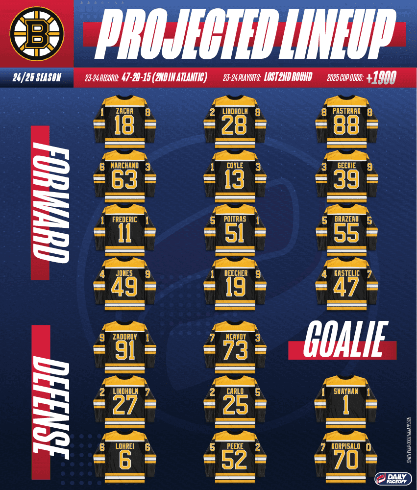 On the blueline, Charlie McAvoy posted his third consecutive 40-point season in 2023-24 and is a shoo-in for the top power play. Hampus Lindholm was not so lucky and saw his scoring cut in half from 53 points in ‘22-23 to 26 a season ago. His baseline probably falls somewhere in between.