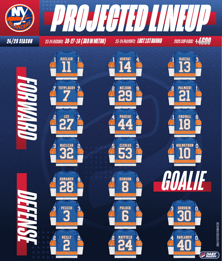Veteran snipers Brock Nelson and Kyle Palmieri also lacked a consistent third linemate in 2023-24. Perhaps hockey’s most underrated forward, Nelson notched a third straight 34-goal campaign. Palmieri, meanwhile, turned back the clock to produce his strongest effort (30G, 54 P in 82 GP) since his age-24 season. The American duo could be joined by debuting power forward Maxim Tsyplakov, who busted out for 31 KHL goals last season with Spartak Moscow. That was the coveted international free agent’s first standout season in his native Russia, so there will be intrigue around his adjustment to the North American game.