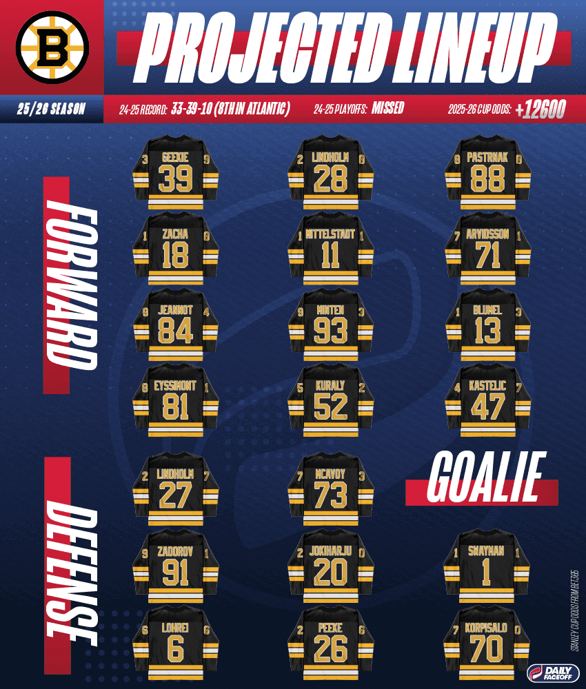 Elias Lindholm and Pavel Zacha remain Boston’s most effective two-way top-six forwards, while Jeannot, Kuraly, and forechecker Mark Kastelic should help tilt the ice in Boston’s favor further down the lineup.
