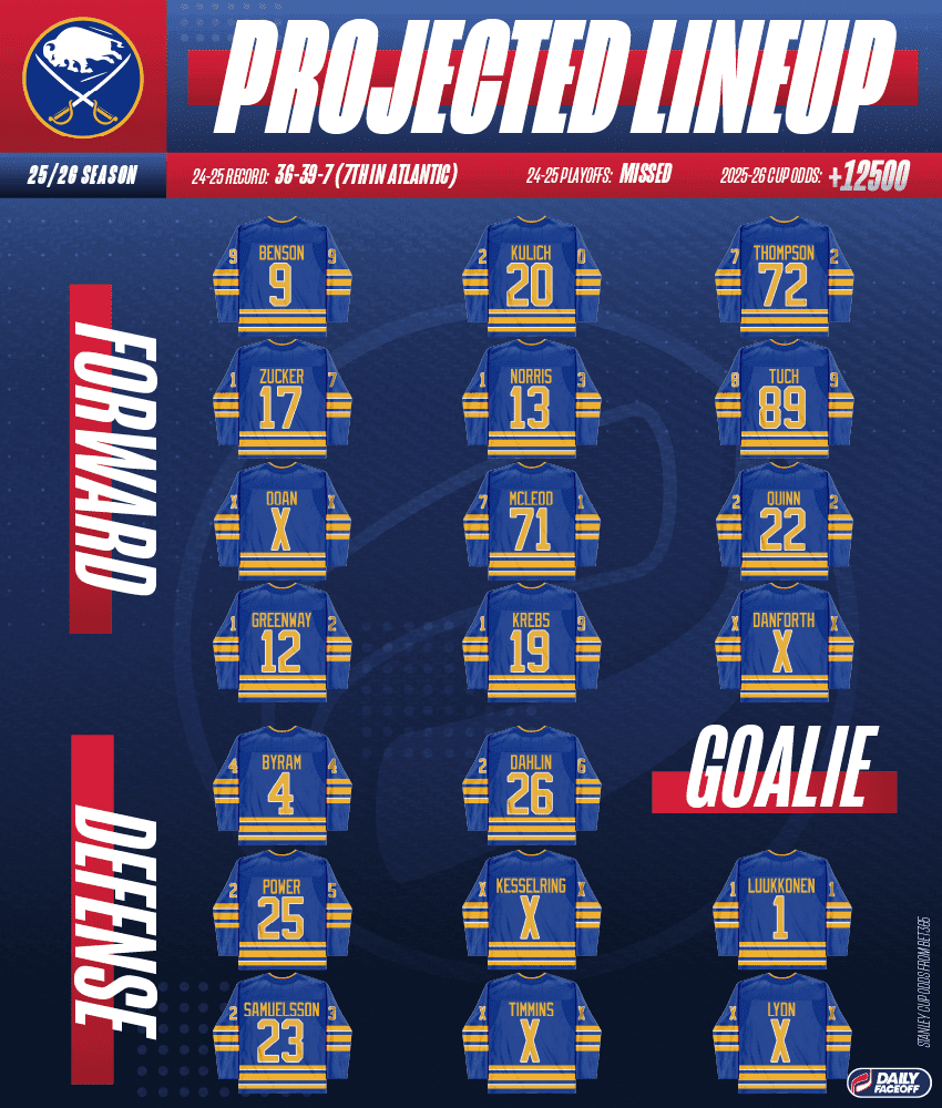 Jersey with an X = player has not yet selected 2025-26 number, per Buffalo Sabres