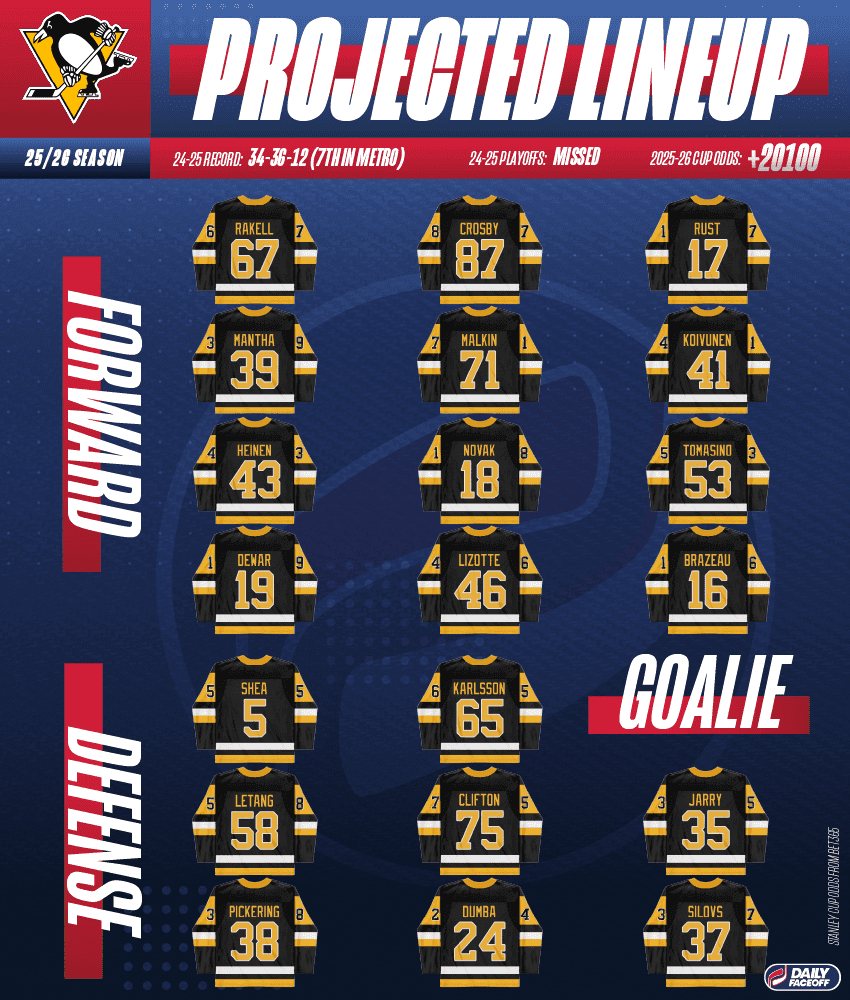 As you can guess: if the Pens scored at a decent rate last season yet didn’t sniff the playoffs, it was because they couldn’t keep the puck out of their own net. They rated among the worst teams in the league in preventing scoring chances and high-danger chances at 5-on-5, and their penalty kill ranked a pedestrian 18th. There’s little reason to expect things to change in 2025-26. Karlsson will continue sponging up as many minutes as possible; while his Norris Trophy years are behind him at 35, he can still drive the play. Is it strange to project just-a-guy Ryan Shea to play top-pair minutes with him? Well, Letang and newcomers Connor Clifton and Matt Dumba are righties, lefty Graves has been a total bust, and youngster Owen Pickering is better off playing sheltered minutes early on, hence the hunch on Shea, who plays a simple and uncomplicated game that could complement the more dynamic Karlsson. We could see Parker Wotherspoon get some starting minutes here, too. No matter how we look at it, this D-corps is pretty clearly a glue-and-popsicle-sticks venture, and the pairings don’t appear remotely solidified at the moment.