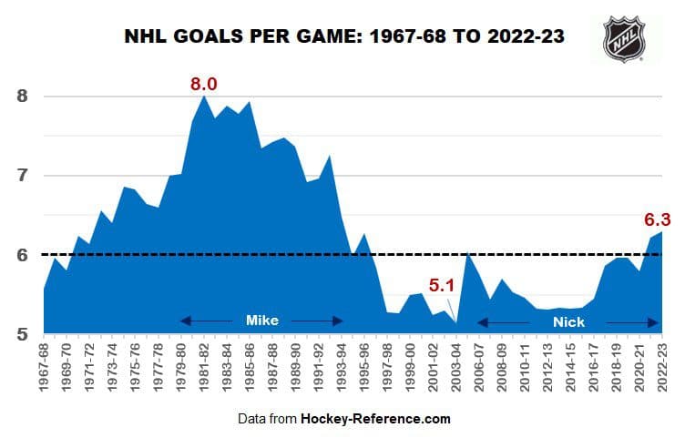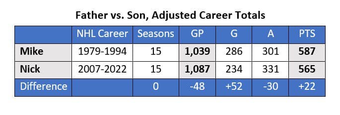 To say Mike’s career began at a favorable time for scoring is an extreme understatement. It’s kind of like saying the Toronto Maple Leafs are due to win a Stanley Cup. Mike played in the greatest offensive paradise an NHL player with scoring punch could hope to call home. As for Nick, well, try as he may to keep up to his old man, he had no chance in this intergenerational faceoff.  Let’s dive into why this is the case.