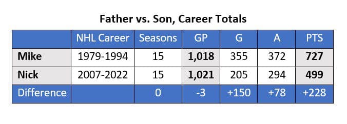 I’m uniquely aware of this first-class family with our mutual roots to Sudbury, Ontario. Mike, a 15-year veteran power forward, retired in 1994. His eldest son, Nick, a rugged and respected leader, is nearing the end of his own NHL journey. To compare the two, here are their stat lines through 15 seasons.
