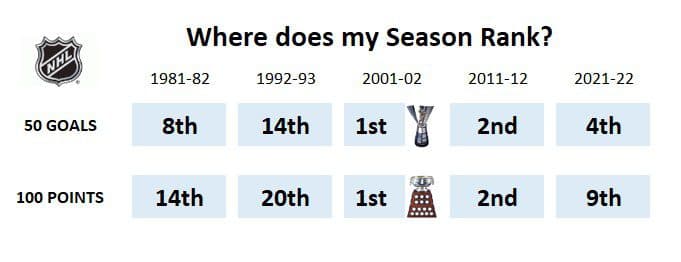 Let’s illustrate using the celebrated 50-goal and 100-point milestones – exclusive benchmarks reserved for the all-time greats. Right?