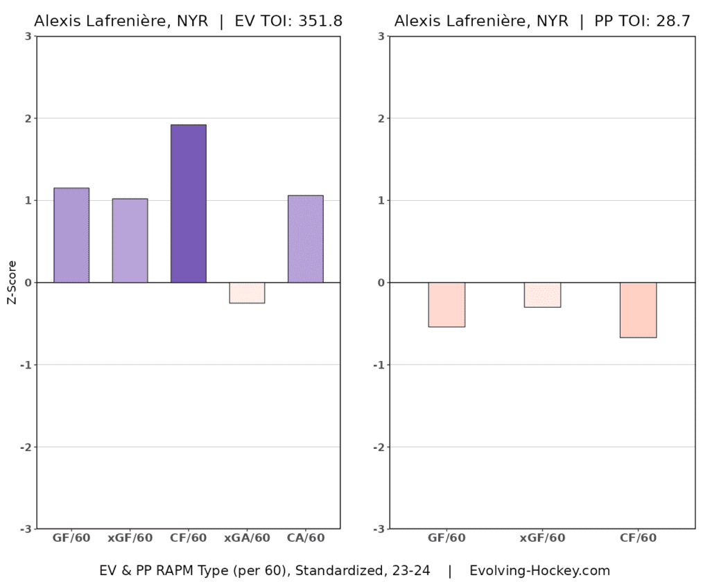 If there’s one thing I’ll add to Steven’s case, it’s to help alleviate any concerns that Lafreniere’s success is due to playing alongside Panarin. That’s certainly helped, but according to Evolving Hockey’s Regularized Adjusted Plus-Minus model, Lafreniere’s success has also been due to his own play, as the numbers indicate his ability to drive offense and play solid defense even when it’s isolated from his linemates.