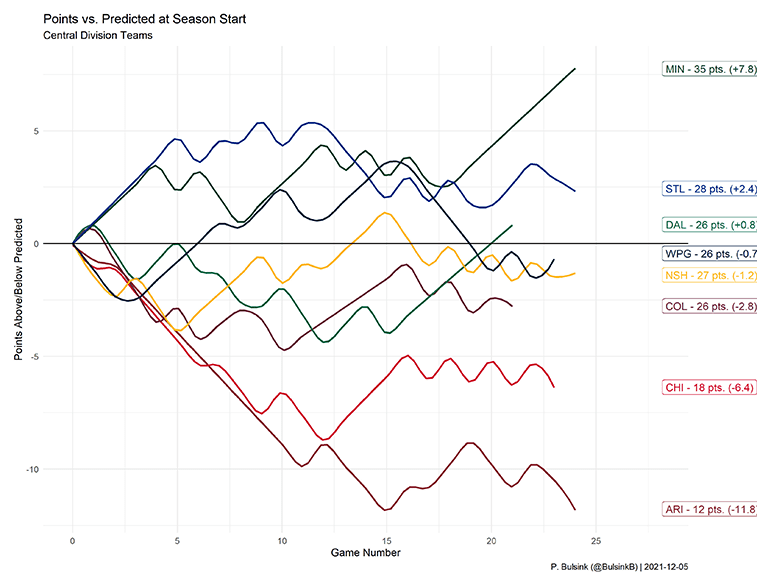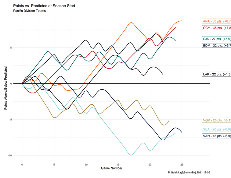 To explain these plots a bit more: they show where teams are compared to the expected, so Los Angeles is about 1.3 points above the expected pace with 22 points thus far, while Vegas has had trouble putting a run together and is 5.1 points below pace, despite having 26 points.