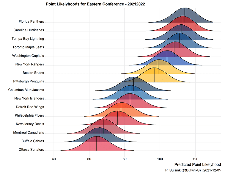 On the upside, though, Florida came out of the starter’s block hot, and have built a solid points base to keep the season going strong. They regularly compete for the Presidents’ Trophy in the model’s season predictions and have set a solid benchmark by which all of the other teams can try to measure themselves.