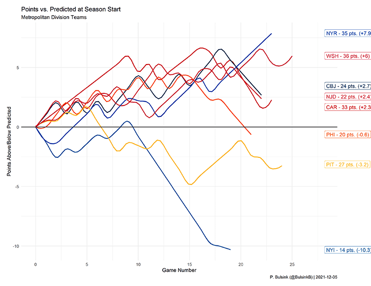 Everyone else is bringing the points in faster than they were expected to. Unless you’re talking about the Islanders. They’ve struggled with COVID in their locker room this year (to the point of having some games postponed) and the lingering effects seem to still be taking their toll. They’ve been under-scoring their xG by a decent bit so far, so if they can get a bit of luck and hit the back of the net, they should be able to turn things around.