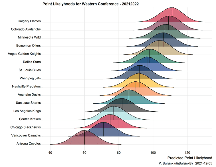 In the west, Calgary has eclipsed Colorado at the top of the predicted points pile, but both are likely to come in with fewer points than the top eastern teams. Arizona is cementing its place in the basement, but the unknown yet is Seattle – two weeks ago the Kraken were looking to be worse than the Coyotes, now they’re nipping behind the Kings and the Sharks. The model is still a little sensitive with only 24 game data points for the Kraken compared to a few hundred or thousand for the remainder of the teams.
