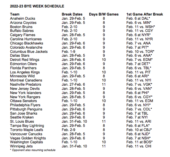 The byes are back in town. Ugh. Sorry. Bad joke. But it’s true. Following a two-season hiatus after COVID condensed the league schedule, the NHL has officially reinstituted midseason bye weeks for 2022-23.