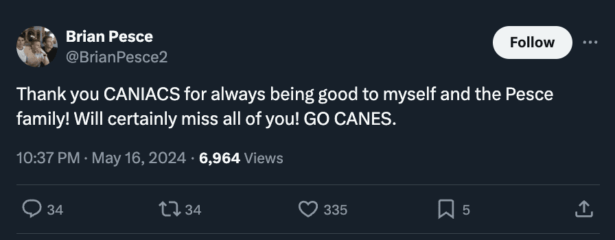 “Thank you CANIACS for always being good to myself and the Pesce family!” Brian Pesce wrote on the post. “Will certainly miss all of you! GO CANES.”