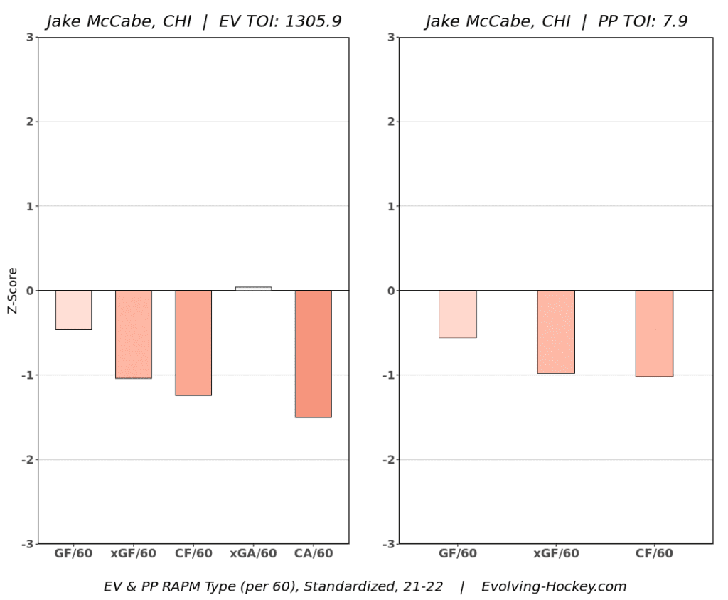 Normally a reliable defensive defenseman, he struggled with Chicago in 2021-22, finishing the year with a 42.01 percent shot attempt share and 44.65 percent expected goal share at even strength. Some of that can be attributed to his defense partners, as a majority of his minutes came playing with Connor Murphy and Seth Jones. Both defensemen tend to struggle in this regard and usually play over their heads in the lineup.