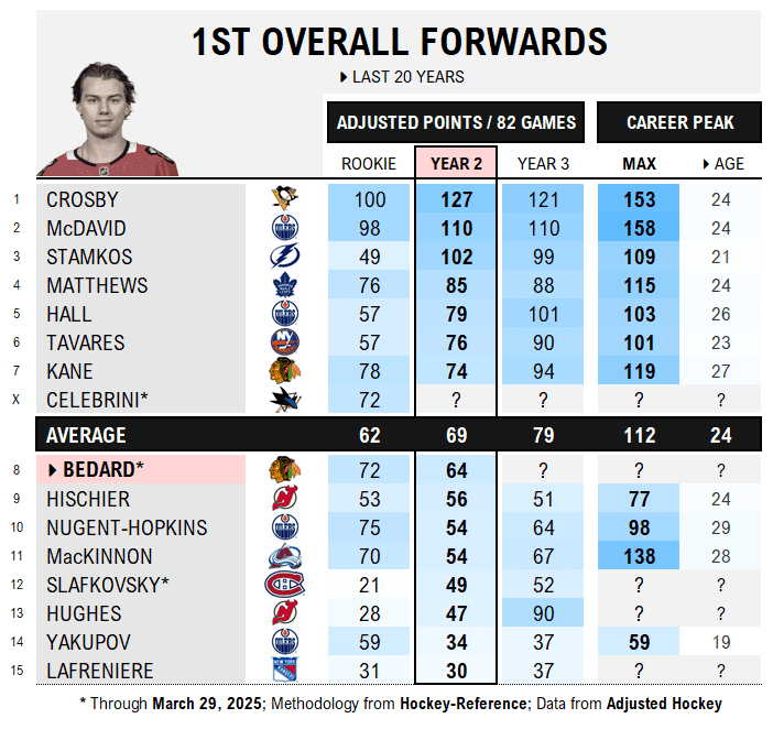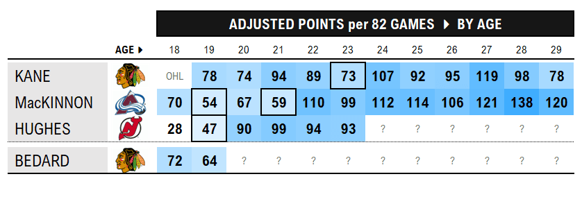 An undersized, skilled, Calder-winning forward drafted first overall playing in Chicago? We know a guy. While Kane was a star on a Cup winner in his age-21 season, it’s revisionist history to think the future Hall of Famer’s evolution was linear. At 23, his adjusted point pace (73) on a mini-dynasty matches Bedard’s rookie season (72). Kane’s marquee season was at 27, which tells us to be patient with Bedard.