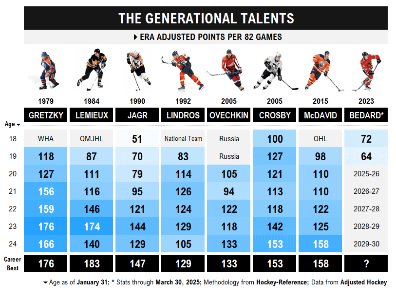 Last March, we’d placed Bedard’s Calder-winning performance against the generational forwards debuting since Wayne Gretzky nearly a half-century ago. Each player’s output was scaled to a neutral scoring climate — six goals per NHL game — and shown over 82 games to level the intergenerational ice surface. Below, we’ll find an updated visual featuring Bedard’s 2024-25 production.