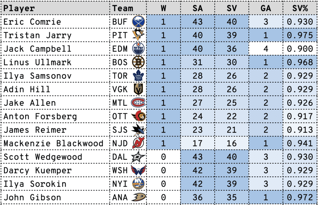 Eric Comrie stopped 40 of 43 shots (.930 SV%) for his second 40+ save win of the week as Buffalo beat the Calgary Flames 6-3 on the road Thursday. Alex Tuch aided in the victory, recording his first career hat-trick (3,4,5), while Rasmus Dahlin added another goal and assist to his total.