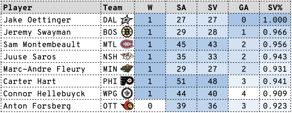 For a fifth straight winning start, Carter Hart’s SV% was above a .933 SV% as he kept his perfect 5-0-0 record in tact Thursday, stopping 48 of 51 shots (.941 SV%) in a 4-3 win over the Florida Panthers. Tony DeAngelo also continued his hot start to the season, scoring a goal (2) and adding four blocked shots to bring him to six points in seven games. Scott Laughton (3), Zack MacEwen (2) and Joel Farabee (2) each had goals for the Flyers. Kevin Hayes and Travis Konecny each picked up a pair of assists to push both above a point per game on the season. Ivan Provorov was held off the scoresheet but put up a freakishly high nine blocked shots in the win. Sergei Bobrovsky allowed four goals on 22 shots as he lost his third straight start. Florida got all their scoring from their defence as Gustav Forsling (2), Josh Mahura (2) and Brandon Montour (2) each picked up their second goal of the season. Montour’s powerplay goal was his fifth point (2G/3A) in six games, as he remains a great fantasy target while filling in for Aaron Ekblad.