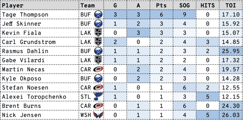 Tage Thompson had the fantasy performance of the year so far as he scored a hat-trick (4,5,6) and added three assists to bring his season total to 12 points (6G/6A) through nine games as he led the Sabres over the Red Wings 8-3.