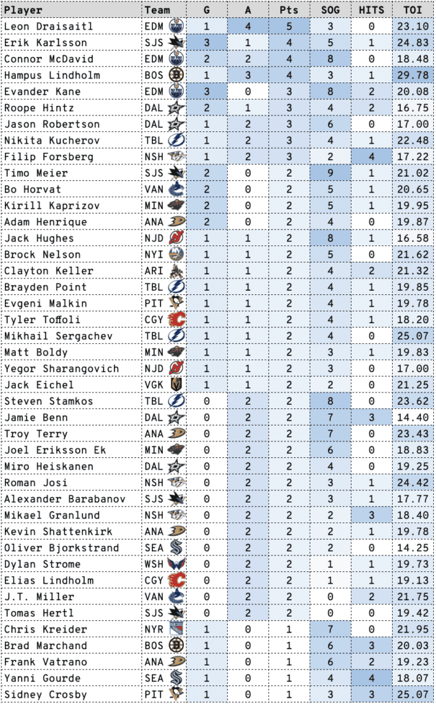 — Brock Seguin (@Brock_Seguin) November 2, 2022Connor McDavid continued his Gretzky-like season, scoring two goals (10,11) with two assists to bring his NHL lead in points to 22 points (11 G/11A) in 10 games. Juuse Saros struggled with Edmonton’s stars all night, allowing a season-high six goals on 36 shots (.833 SV%) as he earned his third loss in four starts. Filip Forsberg had a goal (3) and two assists to lead the Predators, while Roman Josi, Mikael Granlund and Matt Duchene each enjoyed multi-point performances with two assists each.