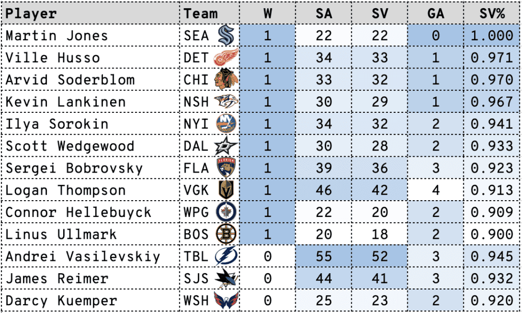 Martin Jones returned from a one-game absence for personal reasons in the most impressive way possible, stopping 22 of 22 shots for his first shutout of the season, moving to 5-3-1 as the Kraken beat the Wild 4-0. Alex Wennberg led Seattle with two goals (2,3) on three SOG while Morgan Geekie (4) and Jamie Oleksiak (3) added the other Kraken goals. Daniel Sprong picked up two assists in only 11:35 TOI, while on the other side Marc-Andre Fleury struggled in the loss allowing four goals on 23 shots (.826 SV%).