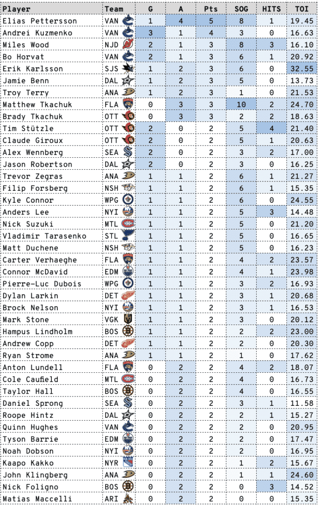 Spencer Martin struggled to stop pucks Thursday, but it did not matter as he allowed five goals on 31 shots (.839 SV%) while still easily winning his second game of the year in an 8-5 victory over Anaheim. Andrei Kuzmenko enjoyed his first superstar moment since joining the NHL, posting his first career hat-trick (4,5,6) while also adding an assist. His massive performance was overshadowed only by Elias Pettersson’s five-point showing (1G/4A) as he has silenced his critics this season, picking up 15 points (5G/10A) in his first 11 games. Bo Horvat added to his team lead in goals as he potted his ninth and 10th goals of the season while also adding an assist. Quinn Hughes also picked up a pair of assists to bring his totals above a point per game, with eight assists in seven games. John Gibson was hung out to dry all night allowing seven goals on 46 shots (.848 SV%) to move to 2-6-1 on the year. Despite the loss, Troy Terry had a goal (5) and two assists to increase his team lead in points to 15 (5G/10) through 11 games, and Trevor Zegras picked up a goal (7) and an assist for his second multi-point effort in the last three games.