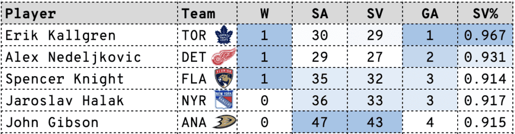 With Ilya Samsonov going on IR on Sunday and Matt Murray still expected to be out for an extended period, Erik Kallgren got a taste of life as a No.1 in the NHL in Carolina. He responded with an incredible 29-save (.967 SV%) performance for his first win of the year as Toronto beat Carolina 3-1. The Maple Leafs spread out their scoring as John Tavares scored his team-leading eighth goal with the game-winner while Calle Jarnkrok (3), and William Nylander (5) each added goals themselves.