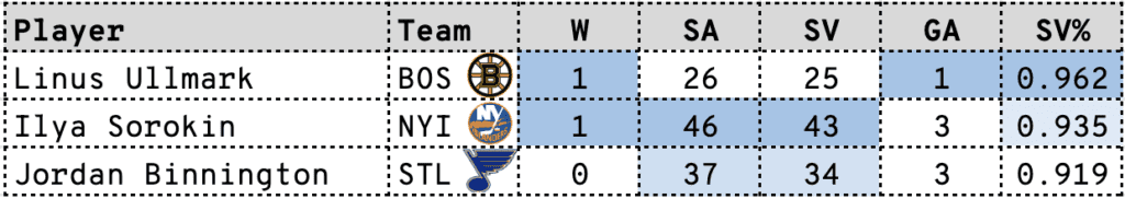 Linus Ullmark picked up his NHL-leading ninth win as he moved to 9-1-0, stopping 25 of 26 shots (.962 SV%) as Boston beat St. Louis 3-1 at home on Monday. Jake DeBrusk (5) and Patrice Bergeron (5) both had power-play goals assisted by Brad Marchand, who now has seven points in five games since coming back early from injury last week. Jordan Binnington stopped 34 of 37 shots (.919 SV%) but picked up his fifth straight loss, posting an .853 SV% over that stretch. Brayden Schenn picked up the lone St. Louis goal (3), which was his 10th point in 10 games (3G/7A) while also adding four hits to lead all players.