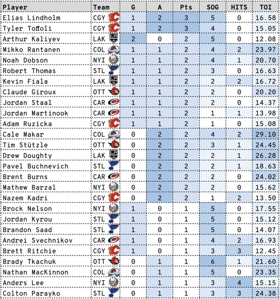 Jacob Markstrom continued to struggle but won as he moved to 6-3-2 after allowing five goals on 29 shots (.828 SV%) as Calgary just narrowly edged out Los Angeles Monday. Jonathan Huberdeau snapped a five-game goalless drought by picking up his second marker of the year minutes into the game. Flames’ head coach shuffled their lines before the game, and it worked instantly, with all four lines scoring a goal in the first period. Adam Ruzicka continued to shine on the Flames’ top line picking up a goal (2) and an assist (3), as he now has four points (2G/2A) in his last two games. Tyler Toffoli picked up a goal (6) and two assists (6,7) along with four SOG, only to be outdone by Elias Lindholm’s two goals (6,7) and one assist effort (6) with five SOG.