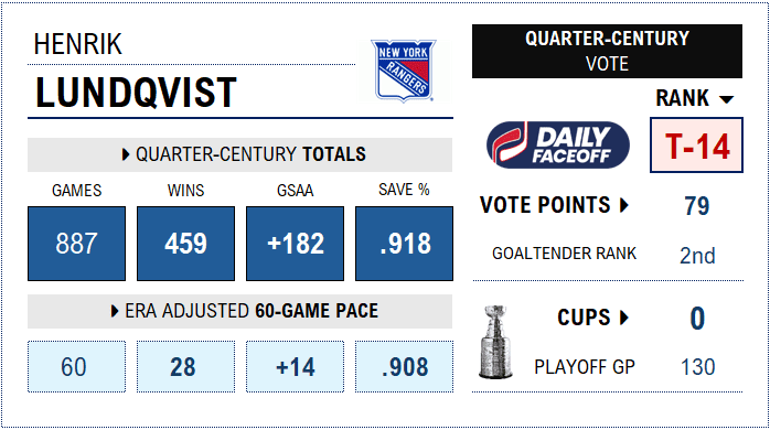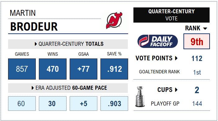 Brodeur was already an elite goaltender by 2000. But does this rank feel a little low considering he’s the all-time wins leader and won all four of his Vezinas and two of his three Cups after 2000? Put differently, if you only took his wins since 2000, he’d still have the fifth-highest total ever. Perhaps Brodeur was penalized slightly because he was partially the product of the New Jersey Devils’ peerless defensive system.
