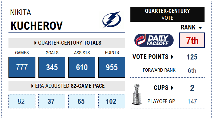 His hands, his deception, all the small little touch plays – they’re all elements of a package that make Kucherov an incredible offensive weapon and perhaps still an underrated one. He shares an era with McDavid, but Kucherov is a two-time scoring champ and two-time playoff scoring champ, throwing up 100-point seasons with ease and a cold swagger. Among players with 200 or more games, only McDavid and Crosby average more points than Kucherov this quarter century.