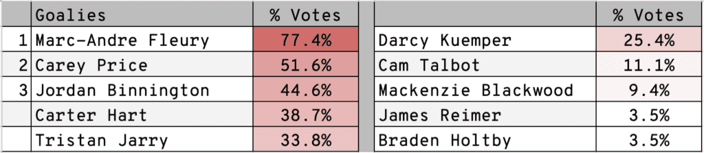 There was a little more debate about which defensemen should be on the team. The locks were Cale Makar, Alex Pietrangelo and Aaron Ekblad. 11 players received at least 30 percent of the vote, with Shea Theodore, Dougie Hamilton, Darnell Nurse, Morgan Rielly and Thomas Chabot rounding out the group.