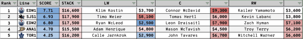 | Henrique – McTavish – Terry Zegras – Strome – Vatrano Comtois – Carrick – Silfverberg White – Megna – Leason Fowler – Kulikov Benoit – Klingberg Vaakanainen – Shattenkirk | Kostin – McDavid – Yamamoto McLeod – Draisaitl – Hyman Foegele – Nugent-Hopkins – Janmark Holloway – Ryan – Puljujarvi Nurse – Ceci Kulak – Barrie Broberg – Bouchard |