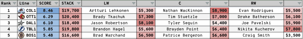 | Dube – Lindholm – Toffoli Lucic – Kadri – Huberdeau Mangiapane – Backlund – Coleman Lewis – Ruzicka – Duehr Hanifin – Andersson Weegar – Tanev Zadorov – Stone | Lehkonen – MacKinnon – Rodrigues Nichuskin – Compher – Rantanen Cogliano – Newhook – O’Connor Blidh – Meyers – MacDonald Toews – Johnson Girard – Englund MacDermid – Hunt |