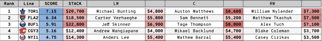 | Bunting – Matthews – Nylander Jarnkrok – Tavares – Marner Kerfoot – Kampf – Engvall Aston-Reese – Holmberg – McMann Rielly – Liljegren Giordano – Holl Sandin – Timmins | Lee – Barzal – Cizikas Bailey – Nelson – Beauvillier Parise – Pageau – Holmstrom Martin – Raty – Johnston Wotherspoon – Pulock Romanov – Mayfield Aho – Dobson |