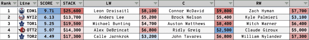 | Draisaitl – McDavid – Hyman Kostin – Nugent-Hopkins – Janmark Foegele – McLeod – Puljujarvi Holloway – Hamblin – Ryan Nurse – Ceci Kulak – Barrie Broberg – Bouchard | Gaudreau – Jenner – Laine Nyquist – Sillinger – Johnson Foudy – Roslovic – Marchenko Robinson – Kuraly – Olivier Berni – Gudbranson Gavrikov – Boqvist Blankenburg – Peeke |