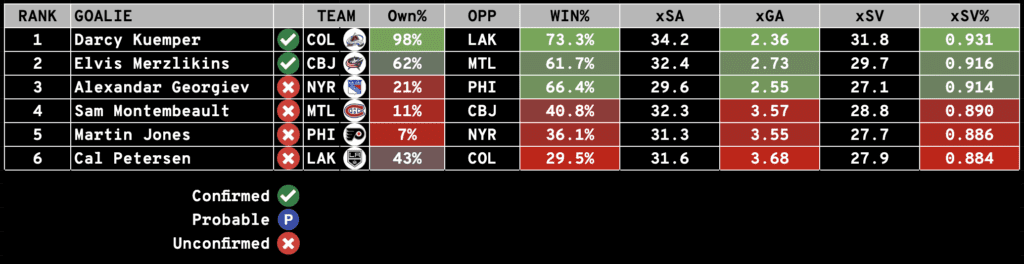 | Burakovsky – MacKinnon – Rantanen Lehkonen – Compher – Nichushkin Newhook – Sturm – Aube-Kubel Cogliano – Helm – O’Connor Byram – Makar Toews – Manson Girard – E. Johnson | Kaliyev – Kopitar – Kempe Moore – Danault – Arvidsson Iafallo – Lizotte – Brown Vilardi – Byfield – Kupari Roy – Durzi Elder – Stecher Maatta – Spence |