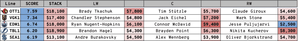 | Tkachuk – Stützle – Giroux DeBrincat – Brassard – Batherson Motte – Pinto – Joseph Kelly – Gambrell – Watson Chabot – Bernard-Docker Sanderson – Hamonic Brannstrom – Holden | Pearson – Miller – Boeser Mikheyev – Pettersson – Kuzmenko Podkolzin – Horvat – Garland Joshua – Aman – Studnicka Ekman-Larsson – Bear Hughes – Schenn Stillman – Myers |