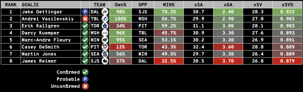 - [DAL] Jake Oettinger (G) will return and start vs. the San Jose Sharks (lower-body).