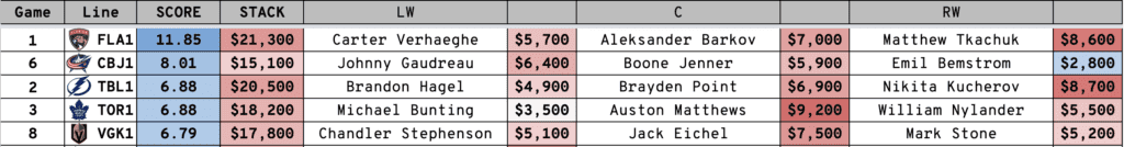 | Verhaeghe – Barkov – Tkachuk Lomberg – Lundell – Reinhart Luostarinen – Bennett – White Cousins – Staal – Hornqvist Forsling – Montour Staal – Ekblad Mahura – Gudas | Ovechkin – Kuznetsov – Sheary Milano – Strome – Johansson McMichael – Eller – Mantha Protas – Dowd – Hathaway Gustafsson – Carlson Fehervary – Jensen Irwin – Van Riemsdyk |