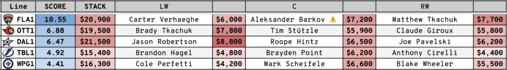| Verhaeghe – Barkov ⚠️ – Tkachuk Loustarinen – Bennett – White Cousins – Lundell ⚠️ – Reinhart Tierney – Staal – Lomberg Forsling – Montour Mahura – Ekblad Kierstad – Staal | Perron – Larkin – Raymond Suter – Rasmussen – Kubalik Erne – Copp – Sundqvist Berggren – Veleno – Czarnik Chiarot – Seider Maatta – Hronek Oesterle – Walman |